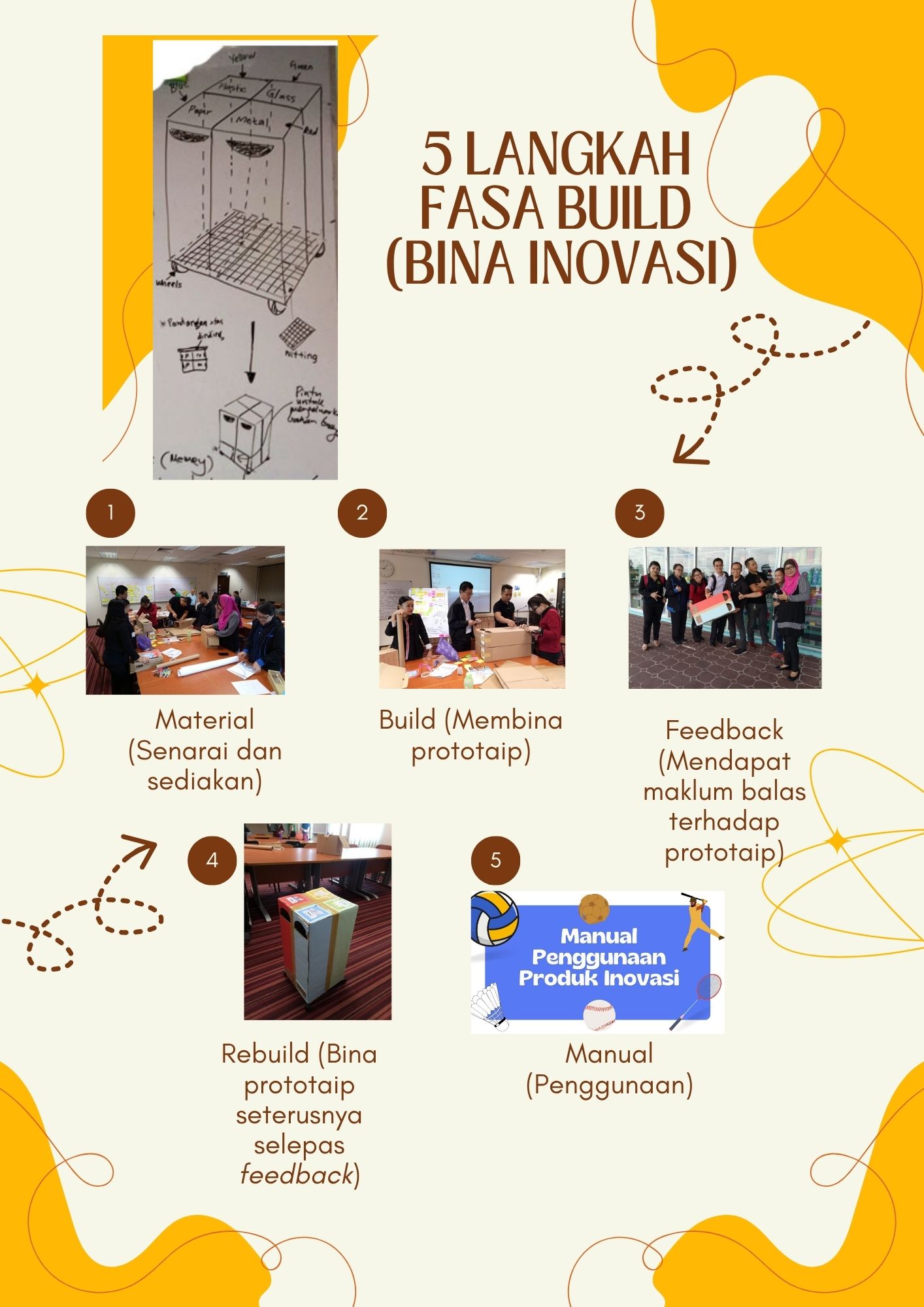 Kumpulan menyenaraikan bahan atau material atau idea berbentuk proses yang diperlukan untuk membina produk atau inovasi atau cadangan kaedah dalam bentuk prototaip yang dicadangkan.
